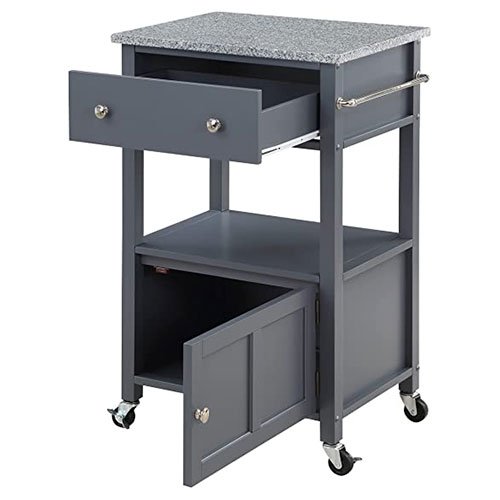 Capturing the classic charm of the modern farmhouse aesthetic, our Kitchen Cart with Granite Top combines beauty and functionality. Its multifunctional design makes it perfect for food preparation, serving, and kitchen storage. Beautiful from every angle, it features a wood painted finish, contrasted with the clean lines of a durable granite food prep surface. Handy top drawer will hold all your cooking utensils. Mid-level open shelving area is ideal for displaying extra-large pots, while the lower storage compartment is perfect for storing large mixing bowls and serving pieces. Towel bar and heavy-duty hardware provide long lasting appeal. A must-have addition to any home, this charming kitchen cart is sure to be your new favorite place for both cooking and stowing away countertop clutter. Incorporated in 1987, Office Star Products has become a leader in commercial office and residential furniture. Office Star Products – Furniture for Your World.